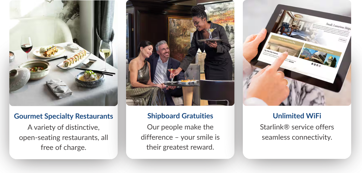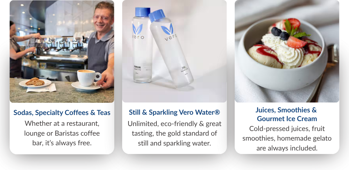 Dining in all of our exquisite specialty restaurants; shipboard gratuities; unlimited WiFi throughout the ship; specialty coffees, sodas, cold-pressed juices, and still and sparkling Vero Water®; free laundry for all guests… and more.