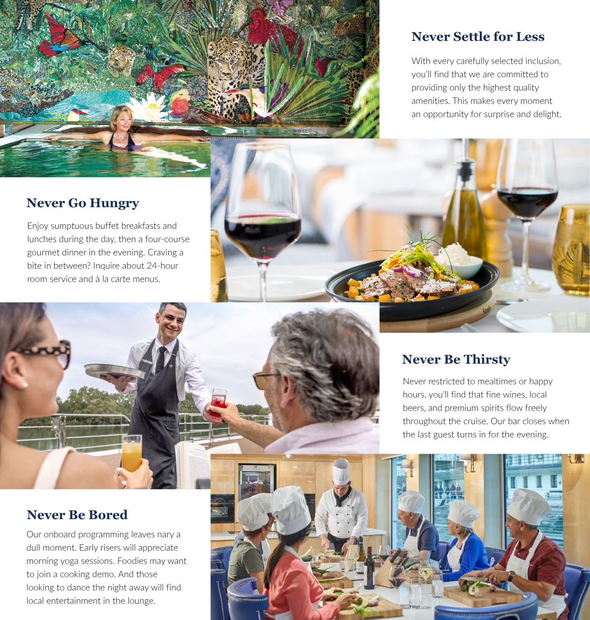 All-Inclusive Dining | Premium Wines & Spirits | Curated Excursions | Airport Transfers | Onboard Gratuities | Exquisite Service